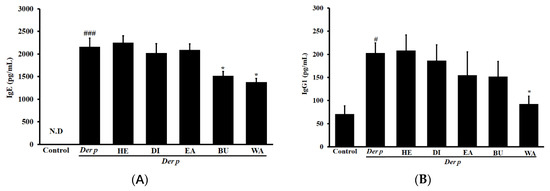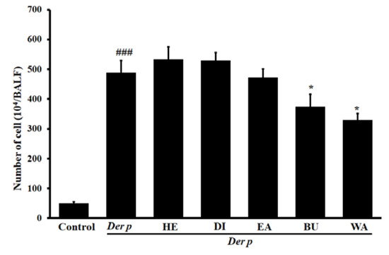 Through random division, the animals were placed into seven groups (n = 10). Group 1 (control) and Group 2 (Der p) were orally given 0.9% saline water. Groups 3–7 were orally administered with 80 mg/kg of one of the extracts (HE, DI, EA, BU, and WA, respectively). The doses were chosen according to previous studies [21,42]. The investigator was blinded to the treatment groups.
