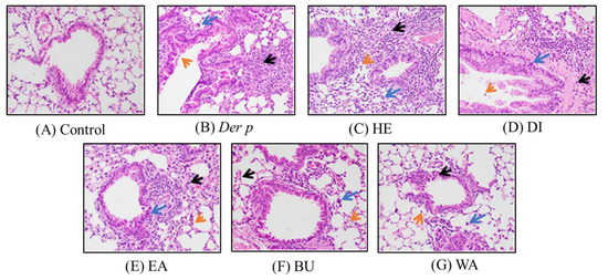 Histopathological findings in the lungs of mice with Der p–induced allergic asthma. Eosinophil is indicated by black arrows, macrophage is indicated by blue arrows and lymphocyte is indicated by orange arrows. (A) control group; (B) Der p group; (C) n-hexane fraction group; (D) dichloromethane fraction group; (E) ethyl acetate fraction group; (F) n-butanol fraction group; (G) water fraction group. (H&E staining, original magnification 400×).