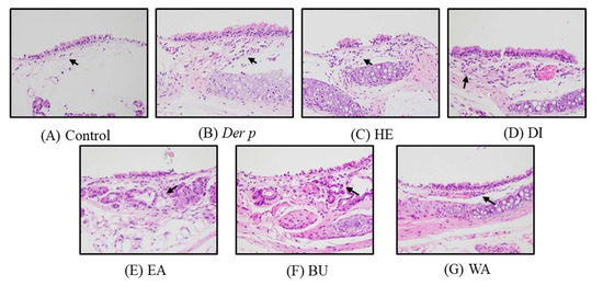 Moreover, bronchial epithelial hyperplasia and goblet cell modification in the bronchus were observed alongside macrophage aggregation in the terminal bronchioles, as seen in Figure 3A,B. The histological changes are evaluated following previous study and the results are also presented in Table 1. In comparison with the Der p control group, the WA fraction group exhibited decreased infiltration in the bronchus, as seen in Figure 3G; however, monocyte infiltration was not significantly reduced in the HE, DI, EA, and BU fractions, as seen in Figure 3C–F. Thus, in asthmatic mice, the WA fraction seemingly inhibits Der p–induced inflammatory infiltration.