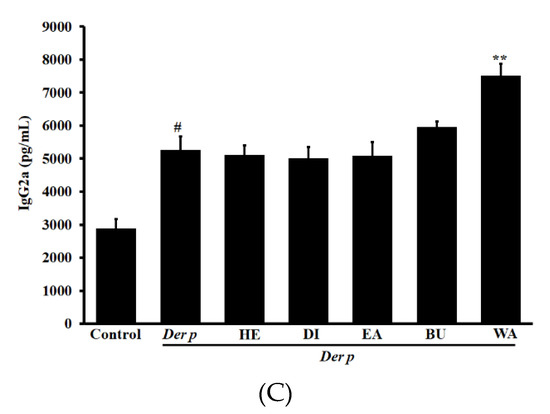 Significant elevations were noted in the serum levels of IgE and IgG1 in the mice with Der p–induced allergic asthma relative to the included controls (p < 0.05), as outlined in Figure 4A,B. However, 80 mg/kg of the WA and BU was determined to significantly attenuate the observed serum levels of IgE (p < 0.05), and 80 mg/kg of the WA was noted to significantly attenuate the observed serum levels of IgG1. Conversely, the WA (80 mg/kg) also increased IgG2a serum levels, as seen in Figure 4C (p < 0.01). No significant differences were noted following treatment with the HE, DI, and EA.