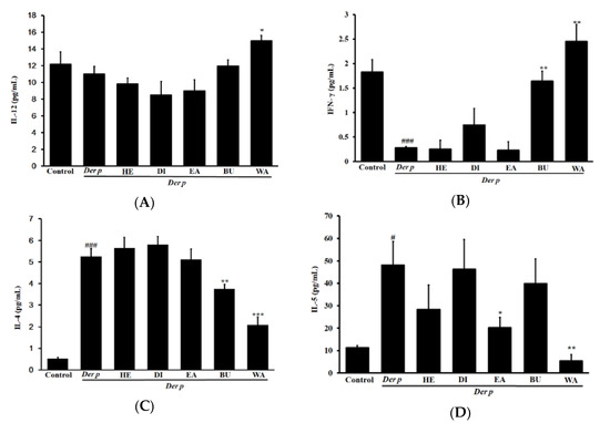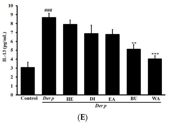 A Th1 and Th2 cytokine imbalance is characteristic of bronchial and tracheal inflammation in asthma. Therefore, to determine the extent to which different fractions of garlic extracts modulate this imbalance, this study quantified the Th1 and Th2 cytokine levels. As displayed in Figure 5, in the Der p group’s BALF, the Th2 cytokine levels of Interleukin (IL)-13, -4, and -5 were noted to increase significantly, but the Th1 cytokine levels of Interleukin-12 (Il-12) and INF-γ were noted to decrease significantly. After treatment executed using different fractions of garlic extracts, the WA fraction decreased the levels of the observed Th2 cytokines IL-13, -4, and -5 but increased the levels of the Th1 cytokines IL-12 and INF-γ when compared with the Der p group. However, the HE, DI, EA, and BU fractions exhibited neither reductions in the observed levels of the Th2 cytokines nor increases in the observed levels of the Th1 cytokine.