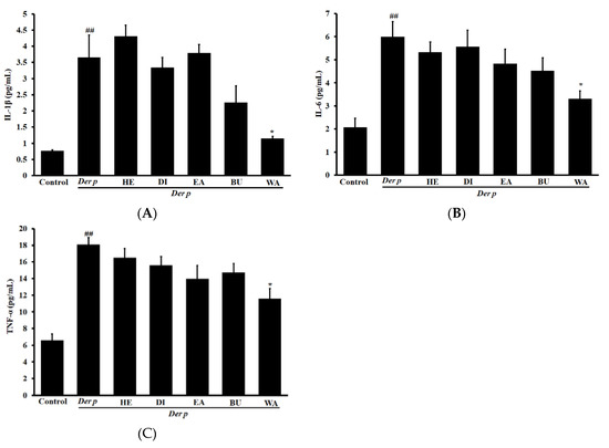 Figure 6 displayed the results of activations of IL-1β, IL-6, and TNF-α in the lungs of various fraction extract groups and Der p group. The levels of IL-1β, IL-6, and TNF-α in the Der p group were higher than control group. However, treatment the with WA significantly reduced the levels of IL-1β, IL-6, and TNF-α. However, there were no significant changes by treatment with the HE, DI, EA, or BU fractions.