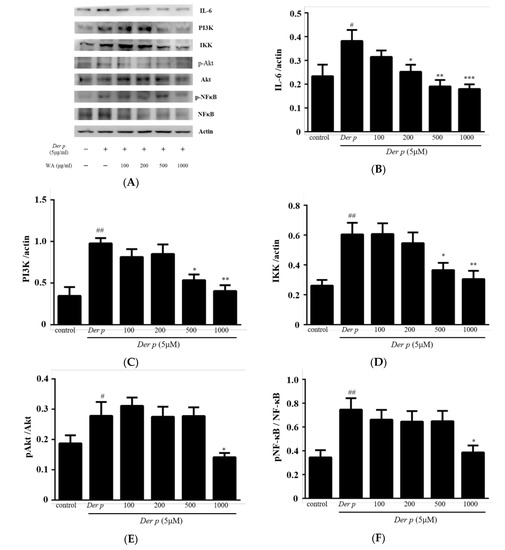 Effect of WA fraction on IL-6/PI3K/Akt/NF-κB expression in Der p-stimulated A549 cells. The cells were pretreated without (−) treatment (Control), with (+) Der-p alone or Der-p plus various concentrations (100, 200, 500, and 1000 μM) of WA fraction for 24 h (A). Proteins isolated from A549 cells were probed with antibodies against (B) IL-6, (C) PI3K, (D) IKK, (E) p-Akt, and (F) p-NFκB. The same membrane was re-probed with the antibody for β-actin to verify that equal amounts of protein were loaded. Data derived are presented herein as mean ± SEM. # p < 0.05 and ## p < 0.01 versus the control group, * p < 0.05, ** p < 0.01 and *** p < 0.001 versus the Der p group.