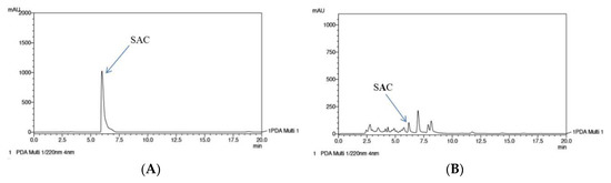 High-performance liquid chromatography (HPLC) chromatographs of the (A) standard and (B) water fraction of garlic extract. SAC: S-allylcysteine.