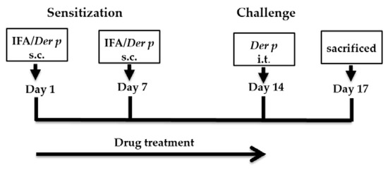 As shown in Figure 10, on days 1 and 7, Groups 2–7 were subcutaneously injected with emulsion (50 μL) containing Der p (50 μg) in incomplete Freund’s adjuvant (Difco, Detroit, MI, USA); the injections were delivered at the base of their tails; on these days, the acquired animals in Group 1 were injected with 50 μL of saline. On day 14, a shot of tiletamine/zolazepam (Zoletil® 50, Virbac Corporation, Carros, France), given intraperitoneally at 20 mg/kg body weight, was administered to anesthetize the mice. With the exception of Group 1, the acquired mice were subjected to treatment using an intratracheal instillation of 50 μL of Der p (1.0 mg/mL), followed by maintaining them upright for a period of 1 min until the restoration of normal breathing [43]. After 72 h since the last Der p challenge, mice were sacrificed. Lung and trachea tissues were removed for histological analysis. Serum and BALF were collected for analysis.