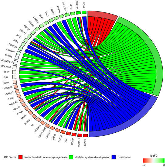 The representation of the mutual relationships between genes, which include “endochondral bone morphogenesis”, “ossification”, and “skeletal system development” GO BP terms. The ribbons show the genes belonging to the given categories. The color bars near each gene correspond to logFC between the vein and artery. The genes were sorted by logFC.