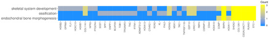 Heatmap showing the gene occurrence between genes that belong to “endochondral bone morphogenesis”, “ossification”, and “skeletal system development” GO BP terms. The yellow color indicates the gene occurrence in indicated GO BP terms. The intensity of the color correlates with the number of GO BP terms to which the selected gene belongs.