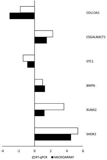 RT-qPCR was performed to validate the results obtained during microarray analysis. The outcomes were presented and compared in the form of a bar graph. As can be seen, the direction of changes in expression was confirmed in all examples. However, the scale of differences in transcription levels varied between both methods analyzed (Figure 5).