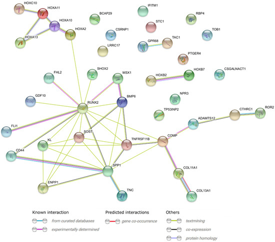 STRING-generated interaction network of genes belonging to the “endochondral bone morphogenesis”, “ossification”, and “skeletal system development” GO BP terms. The intensity of the edges reflects the strength of the interaction score.