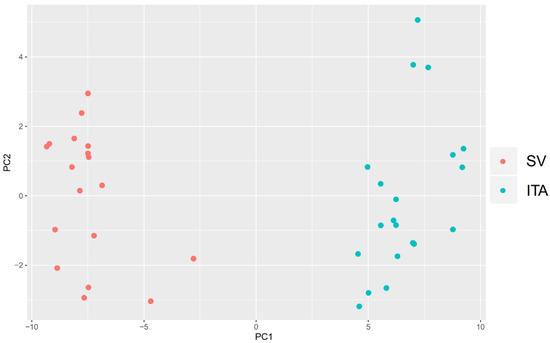 Principal component analysis (PCA) plot of significantly differentially expressed genes, based on the first two principal components’ (PC1 and PC2) loadings against each other. Each dot on the plot (red for saphenous vein (SV) and blue for internal thoracic artery (ITA)) means a single sample of the conduit used in the CABG procedure.