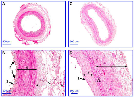 Photomicrograph representing the histological structure of internal thoracic artery (ITA; A,B) and saphenous vein (SV; C,D) segments stained with routine hematoxylin and eosin (H&E) staining. The differences in histological structure can be observed. SV is characterized by a thicker tunica adventitia and subendothelial layer compared to ITA. Arrows: 1—endothelium, 2—internal elastic lamina, 3—tunica intima, 4—tunica media, and 5—tunica adventitia.