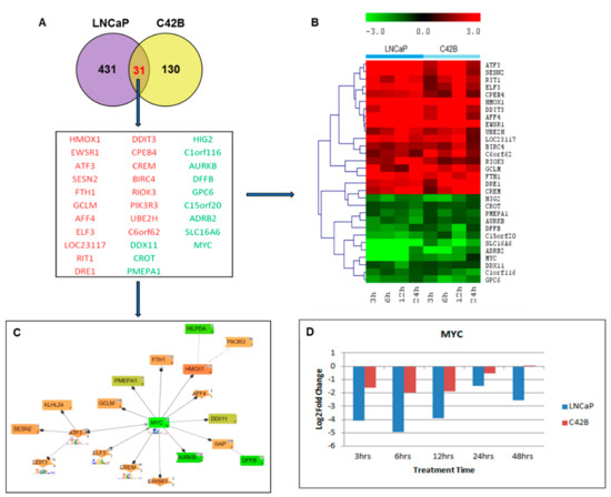 Figure 1. Functional analysis of differentially expressed genes between LNCaP and C4-2B cells by GePS system. (A) The total of 462 and 161 differentially expressed genes were identified from 3–24 h time points in LNCaP and C4-2B cells, respectively. Only 31 genes were found to be co-differentially expressed in both the cell lines. The Venn diagram analysis represents the overlap of LNCaP (purple) and C4-2B (yellow) significant genes with at least 3-fold expression. (B) Heatmap with hierarchical cluster showing the expression levels of the 31 significant genes shared between LNCaP and C4-2B cells clustered into up-regulated (shaded red) and down-regulated (shaded green) groups. (C) The 31 LNCaP and C4-2B shared genes were imported into GePS. Orange/red color shows up-regulation and green color shows down-regulation. The intensity of green and red colors indicates the degree of up or down-regulation, respectively. A solid line represents an expert-curated association between the two gene products, and a dotted line means there is an association by co-citation. This figure illustrates MYC as a significant gene in a central position with the most connected nodes. (D) Time course fold change values (log2) of MYC in LNCaP and C4-2B cell lines after curcumin treatment.