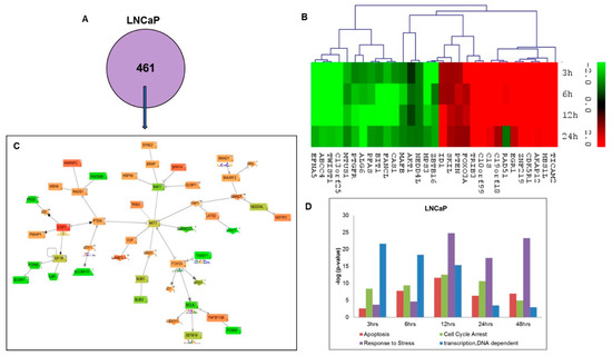 Figure 2. Functional analysis of differentially expressed genes unique to LNCaP cells after curcumin treatment. (A) GePS analysis of significant differentially regulated unique genes (431 genes) to LNCaP cells. (B) Heatmap of top up-regulated and down-regulated genes in LNCaP cells. The intensity of green and red colors indicates the degree of up or down-regulation, respectively. (C) Expert level filter settings were used to generate the network, which contains interactions curated by experts (Genomatix and NetPro) based on literature; genes without any interactions were filtered out. This figure illustrates AKT1, PTEN, and EGR1 as significant genes in LNCaP with the most connected nodes. (D) Gene ontology analysis (Biological Processes) using Genomatix GeneRanker and DAVID Functional Annotation Tool of the unique gene lists from LNCaP cell lines. The majority of the genes’ activities involved in the above-mentioned annotations/processes were found to be increased till 12 h time point.