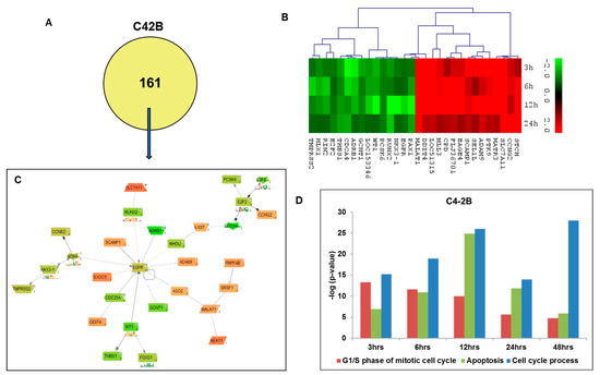 Figure 3. Functional analysis of differentially expressed genes unique to C4-2B cells after curcumin treatment. (A) GePS analysis of significant unique genes (130 genes) to C4-2B cells. (B) Heatmap of the top up-regulated and down-regulated genes in C4-2B. The intensity of green and red colors indicates the degree of up or down-regulation, respectively. (C) Expert level filter settings were used to generate the network and genes without any interactions were filtered out. The network was constructed from 130 input genes and illustrated EGFR and SOX4 as significant genes in C4-2B with the most connected nodes. (D) Gene ontology analysis (Biological Processes)—using Genomatix GeneRanker and DAVID Functional Annotation Tool—of the unique gene lists from C4-2B cell lines. The majority of the genes’ activities involved mentioned above annotations/processes were found to be increased till 12 h time point.