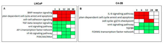 Figure 4. Heatmap of the top canonical pathway categories in LNCaP and C4-2B cells after curcumin treatment at 3–48 h time point. Canonical Pathway Analysis by Genomatix GeneRanker showed the long-term effect of curcumin treatment is only TGF-β receptor in both (A) LNCaP and (B) C4-2B cell lines at 48 h time point. Red squares are categories over-represented in up-regulated genes, and green squares are categories over-represented in down-regulated genes.