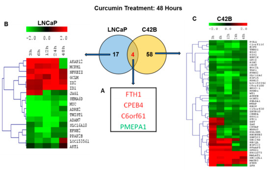 Further, we analyzed the curcumin gene response in LNCaP and C4-2B cells at a 48 h time point to assess the long-term effect of curcumin treatment with respect to androgen responsiveness and non-responsiveness in less aggressive to metastatic prostate cancer. Interestingly, at 48 h post curcumin treatment, only four genes, FTH1, CPEB4, C6orf61, and PMEPA1 were found to be modulated in both the LNCaP and C4-2B cells, (Figure 5A). The genes coded in red color (FTH1, CPEB4, C6orf61) were up-regulated, and the PMEPA1 gene coded in green was down regulated (Figure 5A). On the other hand, a total of 17 genes were differentially regulated in LNCaP cells and 58 genes in C4-2B cells. The heat map showed here in Figure 5B for LNCaP cells and 5C for C4-2B cells representing the expression levels of up- and down-regulated genes at a –2.0 to 2.0 scale in LNCaP and C4-2B cells at different time points.