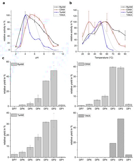 Biochemical characterization of RpAM, CfAM. TeAM and TAKA. (a) pH-profile of all three amylases in comparison with TAKA amylase; (b) temperature profile of all three amylases in comparison with TAKA amylase; (c) product profile of all three amylases and the abundance of oligomers with a degree of polymerization (dp) of 1 to 7 after hydrolysis of starch.