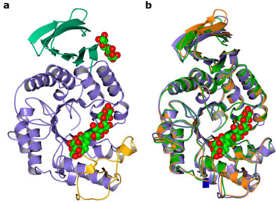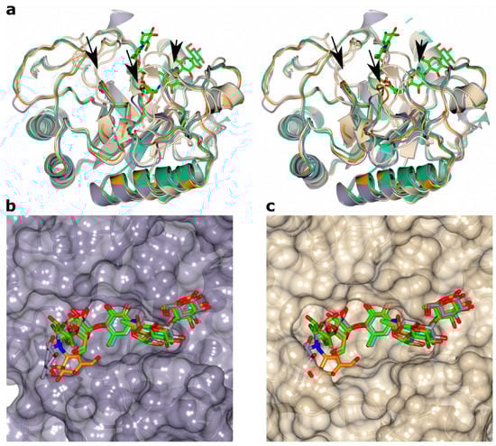 All three amylases have as their hallmark a shortened loop between β2/α3 and two shorter loops in subdomain B located between β3 and α4 of the central (β/α)8-barrel, compared to structures of other fungal amylases, e.g., TAKA-amylase (Figure 5a). The importance of subdomain B for the physicochemical properties—for example, pH-stability, as well as substrate and product specificity, is well known [21,22,23,24]. Indeed, the shorter loops open up the substrate crevice on the non-reducing end (Figure 5b), which might explain the shift in the product profile for all three amylases towards oligomers with a higher dp compared to TAKA amylase (Figure 1c and Figure 5c).