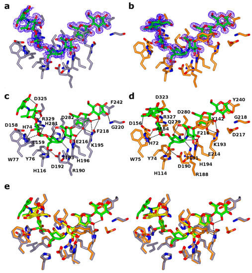 Acarbose transglycosylation product binding in CfAM and TeAM. (a,b) stick representation of the acarbose derived transglycosylation product in the substrate binding crevice of CfAM and TeAM, respectively. The 2Fo-Fc electron density around the ligands is contoured at 0.3 e/Å3. The interacting residues are shown as cylinders. (c,d) hydrogen bonding pattern between ATgp and CfAM and TeAM in the active site. (e) stereo view of the overlay of the binding crevice of CfAM (purple) and TeAM (orange). The residues and the ligands overlap very closely with the only major difference being the orientation of the acarviosine subunit in subsite -4.