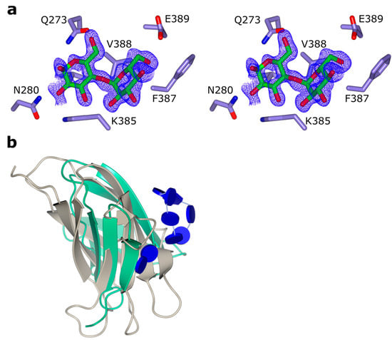 The secondary maltose binding site in the C-terminal domain of CfAM. (a) stereo view showing the maltose in cylinder representation with the corresponding 2Fo-Fc electron density contoured at 0.4 e/Å3. The interacting residues are shown as blue cylinders; (b) superposition of the C-terminal domain (green) with the CBM20 domain from A. niger glucoamylase (pdb-ID: 1ac0) in beige. The bound β-cyclodextrin of CBM20 and the maltose unit are shown as glycoblocks [15].