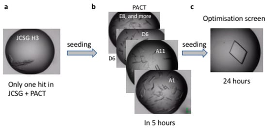 - D'Arcy, A.; Bergfors, T.; Cowan-Jacob, S.W.; Marsh, M. Microseed matrix screening for optimization in protein crystallization: What have we learned? Acta Crystallogr F Struct Biol Commun 2014, 70, 1117–1126. [Google Scholar] [CrossRef]