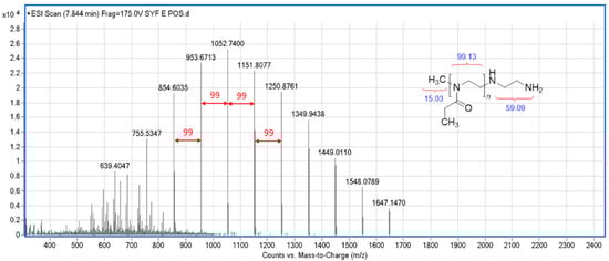 Mass spectrometric analysis of amine-end functionalized PEtOx (PEtOx-NH2) showing a regular separation of 99 Da corresponding to the molecular weight of an EtOx repeating unit. The red arrows indicate the regular separation of 99 Da, corresponding to the molecular mass of an EtOx repeating unit. The blue numbers are the mass (in Da) of the respective chemical groups.