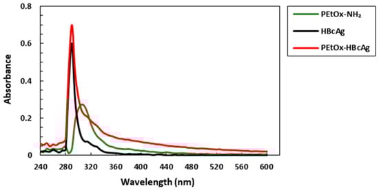 UV-visible spectra of the conjugation of PEtOx-NH2 to hepatitis B core antigen (HBcAg) virus-like nanoparticles (VLNPs). UV-visible measurements of HBcAg VLNPs (0.7 mg/mL), PEtOx (0.7 mg/mL), and PEtOx-HBcAg VLNPs (0.7 mg/mL) were determined using a spectrophotometer. The absorbance at wavelengths ranging from 240 to 600 nm was measured at room temperature.