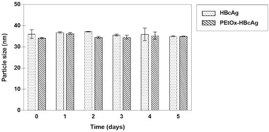 Colloidal stability of HBcAg and PEtOx-HBcAg VLNPs in Tris-buffered saline (TBS) over five days at 37 °C. Measurements of particle size were performed daily in triplicate (n = 3), and the error bars represent the standard deviations from triplicate measurements.