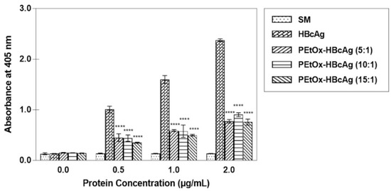 Antigenicity of the PEtOx-conjugated HBcAg (PEtOx-HBcAg) VLNPs at different protein concentrations with different molar ratios of PEtOx-NH2 to HBcAg VLNPs: PEtOx-HBcAg (5:1, 10:1, and 15:1). ELISA assays were performed in triplicate (n = 3), and the error bars represent the standard deviation from triplicate measurements. **** p < 0.0001 indicates the significant difference of PEtOx-HBcAg VLNPs compared with HBcAg VLNPs (positive control). Skim milk (SM) served as the negative control.