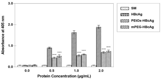 Comparison of the antigenicity of the PEtOx-conjugated HBcAg (PEtOx-HBcAg) and methoxypolyethylene glycol amine (mPEG)-conjugated HBcAg (mPEG-HBcAg) VLNPs at different protein concentrations. ELISA assay was performed in triplicate (n = 3), and the error bars represent the standard deviation from triplicate measurements. **** p < 0.0001 indicates the significant difference of PEtOx-HBcAg VLNPs and mPEG-HBcAg VLNPs compared with HBcAg VLNPs (positive control). Skim milk (SM) served as the negative control.