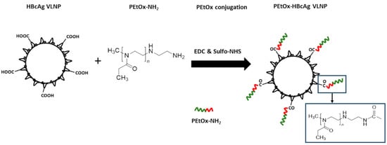 Conjugation of PEtOx-NH2 to HBcAg VLNPs was performed via the EDC and Sulfo-NHS coupling method. The carboxylate groups of HBcAg VLNPs were activated by incubating HBcAg VLNPs (0.04 mM) with EDC (0.6 mM) and Sulfo-NHS (0.6 mM) in sodium phosphate buffer (25 mM NaH2PO4/Na2HPO4, pH 7.0; 300 μL) at 4 °C for 2 h. Then, PEtOx-NH2 (0.2 mM) was added into the reaction mixture containing the activated HBcAg VLNPs. The mixture was incubated at 4 °C for 20 h and dialyzed extensively against sodium phosphate buffer at 4 °C using 10 kDa cut-off dialysis membranes (Sigma-Aldrich, St. Louis, MO, USA) to eliminate excess PEtOx-NH2, EDC, and Sulfo-NHS.