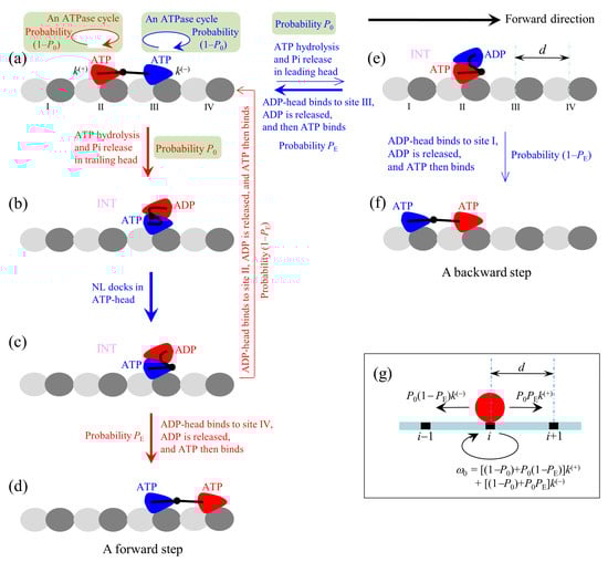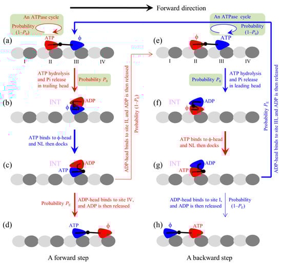 In Figure 1e after the ATPase activity (ATP hydrolysis and then Pi release) taking place in the leading head, there are also two possible cases that can occur. There is a probability 1–P0 that the head still binds to site III but an ATPase cycle (consisting of ADP release, ATP binding, ATP hydrolysis, and then Pi release) takes place (the transition shaded in light green). There is also a probability P0 that the ADP-head diffuses to the INT position (Figure 1f). ATP binding to the MT-bound head induces its NL docking, weakening its interaction with the ADP-head (Figure 1g). Then, by overcoming EI and the ADP-head rebinds to the previous site III with affinity Ew2, and releases ADP (Figure 1a). The transition (from Figure 1e to f to g to a) gives a futile chemomechanical coupling cycle. From Figure 1g, it is also possible that by overcoming EI, ED, and the ADP-head diffuses to and binds to site I with affinity Ew2, and releases ADP (Figure 1h). The transition (from Figure 1e to f to g to h) gives a backward step by hydrolyzing one ATP molecule. Because the transitions of Figure 1g to a and to h overcome the same energy barriers as the transitions of Figure 1c to d and to e, respectively, the transition from Figure 1g to a and that from Figure 1c to d occur with the same probability PE and the transition from Figure 1g to h and that from Figure 1c to e occur with the same probability 1–PE.