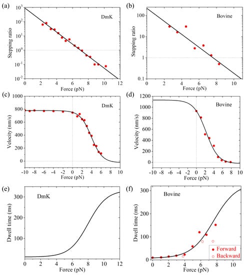 In order to further verify the model, it is hoped that the predicted results can be tested in future experiments. For example, using single-molecule optical trapping techniques, the predicted results on the force dependence of stepping ratio for HsK and HsK-6AA (Figure 5b), HsK (Figure 6b) and KIF17 (Figure 8c) can be tested. Using single-molecule optical trapping techniques complemented with using a fluorescent ATP analogue (deac-aminoATP), we can simultaneously monitor processive stepping and nucleotide binding/dissociation under different forces, similar to that used by Sakamoto et al. [] to study the chemomechanical coupling of myosin-V. Thus, the predicted results on the force dependence of the number of ATPs consumed per step, which is equivalent to the inverse of the chemomechanical coupling ratio, for different species of kinesin motors (Figure 6d, Figure 7f and Figure 8d) can be tested. The straightforward comparison of the predicted results with the experimental data is critical to prove the model.