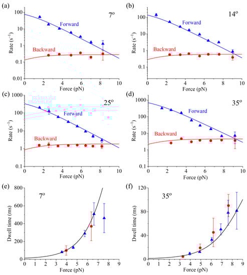 Thermodynamics of WT bovine brain kinesin-1 at saturating ATP. Lines represent analytical solutions. Symbols are experimental data at 1 mM ATP taken from Taniguchi et al. []. Adapted by permission from Springer Nature: Taniguchi, Y.; Nishiyama, M.; Ishii, Y.; Yanagida, T. Entropy rectifies the Brownian steps of kinesin. Nat. Chem. Biol. 2005, 1, 342–347. Licence number: 4680771382349. (a–d) Forward and backward stepping rates versus external force at different temperatures. (e,f) Dwell times between two mechanical steps versus external force at different temperatures. Blue and red symbols represent the experimentally measured dwell times for forward and backward steps, respectively.