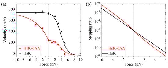 Dynamics of HsK and HsK-6AA at saturating ATP. (a) Velocity versus external force. Lines represent analytical solutions. Symbols are experimental data at 2 mM ATP taken from Andreasson et al. []. (b) Analytical solutions of stepping ratio versus external force.
