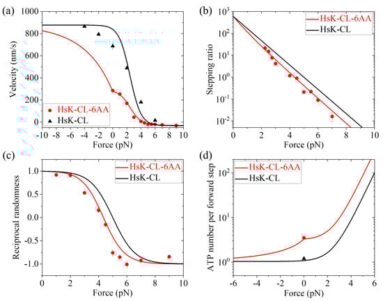 By contrast, using models presented in the literature to fit the single-molecule data, many more adjustable parameters are required for a species of the kinesin and moreover, different parameters values are required for the WT case and the corresponding case with extension of its NLs. For example, 10 and 13 parameters were adjustable in References [] and [], respectively, to fit the single-molecule data shown in Figure 7 for only HsK-CL-6AA. Moreover, with those fitted parameter values, the calculated numbers of ATP molecules consumed per forward step under no load are far away from the experimental value of 3.5 []. In addition, with those fitted parameters, the calculated ATPase rate of the motor during its processive movement is changed significantly as the force is varied in the small range from 0 to 4 pN (near the stall force), implying that variation of the NL strain by only 4 pN can result in a significant change in the ATPase rate. This is in contrast to the available experimental data showing that extending NLs of kinesin-1 dimer via adding different numbers (2–26) of residues in each NL (implying variation of the NL strain from about 30 pN to 0 pN [,]) has nearly no effect on the ATPase rate of the motor during its processive movement [].