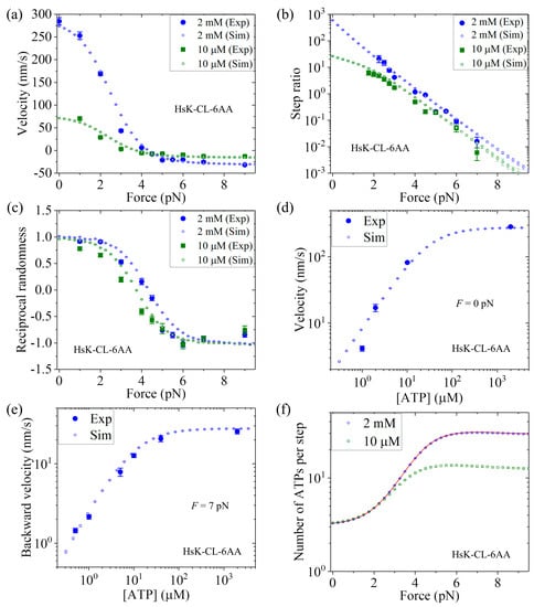 Dynamics of HsK-CL-6AA at different ATP concentrations. Unfilled symbols are MC simulated data, with error bars representing SEM (n = 1000), line is the analytical solution at saturating ATP, and filled symbols are experimental data taken from Clancy et al. [] Adapted by permission from Springer Nature: Clancy, B.E.; Behnke-Parks, W.M.; Andreasson, J.O.L.; Rosenfeld, S.S.; Block, S.M. A universal pathway for kinesin stepping. Nat. Struct. Mol. Biol. 2011, 18, 1020–1027. Licence number: 4680780256064. (a) Velocity versus external force. (b) Stepping ratio versus external force. (c) Reciprocal randomness versus external force. (d) Velocity versus ATP concentration under no external force. (e) Backstepping velocity versus ATP concentration under backward force of 7 pN. (f) Number of ATP molecules consumed per step versus external force.