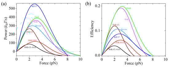 Using Equation (22) and with parameter values given in Table 1, the calculated results of the power versus backward force for different species of kinesin motors are shown in Figure 9a. From Figure 9a we see that the maximum power (in units of kBT/s) decreases in the following order: 552.6 (KIF17) > 388.5 (DmK) > 362.4 (HsK) > 300.1 (Bovine) > 265.1 (HsK-CL) > 117.0 (HsK-6AA) > 86.0 (HsK-CL-6AA). Among the seven kinesin molecular motors studied here, KIF17 has the best performance by providing the highest power of about 552.6 kBT/s, whereas HsK-CL-6AA has the worst performance by providing the lowest power of about 86 kBT/s. These results indicate that the power provided by WT kinesin-2 (KIF17) is larger than that by WT kinesin-1 (DmK, HsK, and Bovine). The power by WT kinesin-1 is larger than that by the mutant with a residue cysteine in the NL domain being mutated (HsK-CL). The extension of the NLs (HsK-6AA and HsK-CL-6AA) reduces the power relative to that without the extension of the NLs (HsK and HsK-CL).