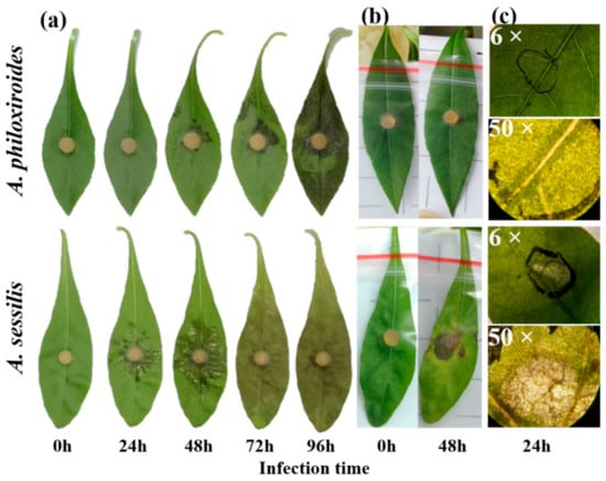 Disease symptoms caused by R. solani on invasive A. philoxiroides and native A. sessilis showing (a) in vitro detached leaf assay; (b) in planta pathogenicity test; and (c) microscopic observation of the infected area on leaves (at 24 hpi). Four-week-old plant leaves were inoculated with mycelium plugs of R. solani and disease symptoms were observed at various time intervals (24, 48, 72 and 96 hpi). For in planta tests, plastic bags were placed on the leaves after inoculation to avoid drying of plugs and moisture development for better infections. In (c), the inoculated area is circled with a black marker. After removing plugs, threads of fungal mycelium can be seen on the leaf surface in A. philoxiroides, indicating fungal colonization. This is in contrast to the clear necrotic disease lesions in A. sessilis.