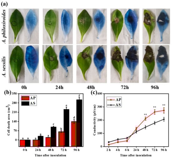 To visualize dead plant cells and to measure the cell death area of infected leaves, trypan blue staining was performed on the leaves of four-week old infected A. philoxiroides and A. sessilis. Leaves were removed at each time interval (0, 24, 48, 72, and 96 hpi) and stained with lactophenol-trypan blue, followed by de-staining with saturated chloral hydrate using the method of Koch and Slusarenko []. Samples were photographed every day before and after staining to measure the diameter of the infected area using ImageJ []. To further confirm cell death, ion leakage assay was performed on infected leaves of both species using an electrolytic conductivity meter (model P772) following the procedure outlined in Hatsugai and Katagiri [].
