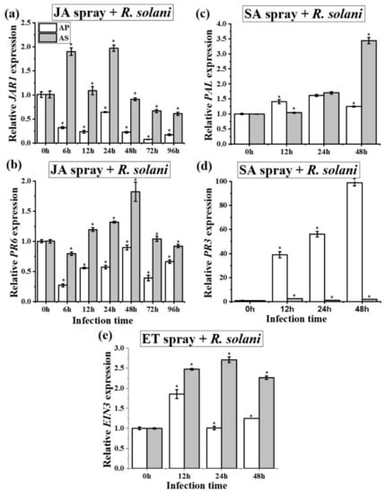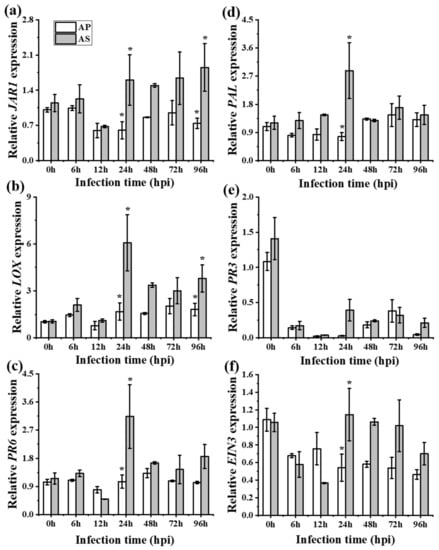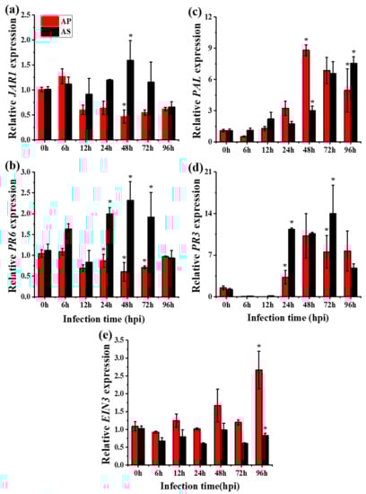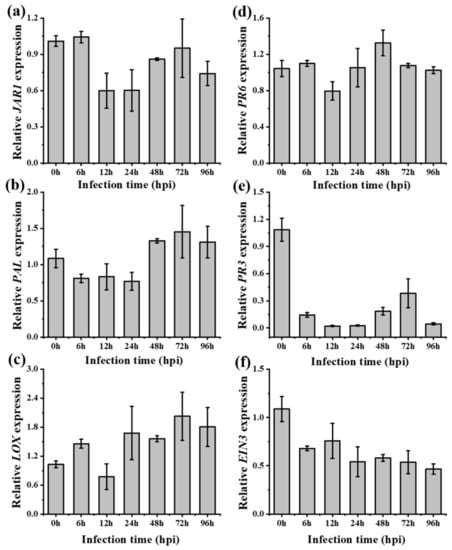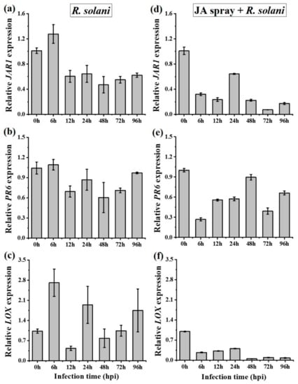 Our study demonstrates how a common and widespread pathogen regulates plant defense hormones (SA, JA, and ET) allowing for the successful infection of an invasive species, A. philoxeroides (using RT-qPCR). Our results showed that both JA-JAR1 and PR6 transcript expressions decreased during disease development following inoculation with R. solani AG4 HGI (Figure 6a,b), indicating that JA-signaling pathway is likely to be involved in plant resistance to the pathogen. There is much evidence to suggest that endogenous JA is triggered against necrotrophic pathogens [,]. For example, gene expression changes induced by R. solani AG1 IA in resistant and susceptible rice plants have been reported and it has also been shown that JA plays an important role in disease resistance []. In the present study, we found that the JA biosynthetic LOX gene was inconsistent in expression (Figure 6c). This was consistent with the findings of a previous study [], where it was found that LOX expression increased approximately 6-fold in response to virulent and avirulent strains of Pseudomonas syringae.