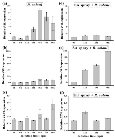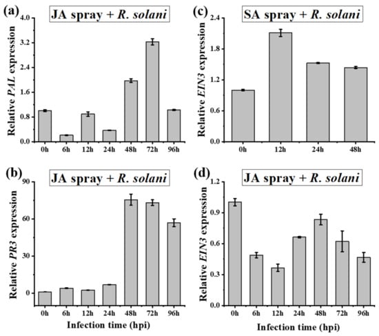 PR genes are often associated with specific signaling pathways and their expression can be regulated by different plant hormones []. In our study, at 48 hpi, the SA-inducible PR3 showed a 10-fold higher expression to R. solani infection (Figure 7b), a 100-fold higher expression for SA pretreatment (Figure 7e), and a 75-fold higher expression for JA pretreatment (Figure 8b). This increase in SA-inducible PR3 supports the hypothesis that SA enhances disease development by suppressing JA in A. philoxeroides.