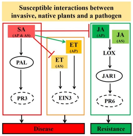Invasive plants may encounter multiple pathogens with different infection strategies in their non-native range. Hormonal cross-talk provides signals to adjacent leaves from local infected tissues to resist a forthcoming infection [,,]. This systemic defense is effective against pathogens with a similar attacking strategy []. For pathogens with a different infection mode, hormonal cross-talk between pathways (specifically SA and JA) plays a critical role in plant resistance [,]. The biotrophic pathogen inducing SA can activate antagonism to JA in infected local and systemic tissues, which in turn favors insect herbivores or necrotrophic pathogens [].