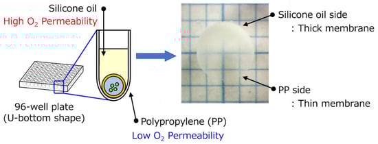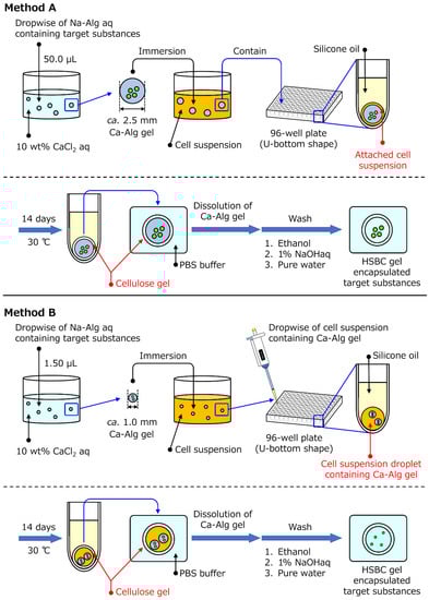 The HS medium was sterilized via autoclaving, and then G. xylinus (IFO13772) was cultured in the HS medium at 30 °C for 3 days. The prepared spherical Ca-Alg gels that included the target substances were immersed in the cultured cell suspension and inoculated with G. xylinus for one day at 30 °C. In method A, spherical Ca-Alg gels, where the cell suspension remained at the gel surface, were immersed in each well of a 96-well plate (Caplugs Evergreen, Buffalo, New York, item: 290-8353-03R) filled with silicone oil. In method B, a 10-µL cell suspension with small Ca-Alg gels including micrometer-sized particles was dropped in each well filled with silicone oil. While maintaining these states, G. xylinus in the cell suspension was cultured for a specified period at 30 °C. This 96-well plate had a U-shaped bottom and was composed of PP. In both methods A and B, the BC gelatinous membrane was produced on the interface of the cell suspension and the silicon oil. After 2 weeks, the resulting gel was immersed in phosphate buffered saline (PBS) to dissolve the Ca-Alg gel. After removing the Ca-Alg gel, the remaining silicone oil on the HSBC gel was removed by washing with ethanol. The substance-encapsulated HSBC gel thus produced was purified by soaking it in a large amount of distilled water for 1 day, followed by washing in a 1% (w/v) aqueous solution of NaOH at room temperature for 1 additional day to remove the bacterial cell debris and alkali-soluble components completely. Then, it was washed several times with a large amount of distilled water and stored in distilled water at room temperature.