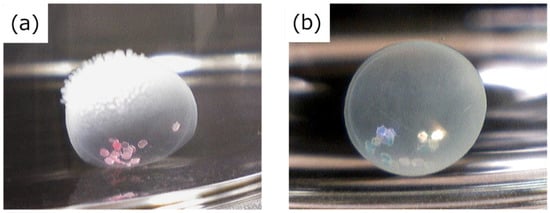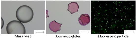 Spherical alginate gels (Ca-Alg gel) including the target substances (glass beads or cosmetic glitter) were prepared by dropping 50 µL of 1 wt% Na-Alg aqueous solution (Na-Alg aq) including these substances into a 10 wt% calcium chloride aqueous solution (CaCl2 aq). To drop 1 wt% Na-Alg aq including glass beads or cosmetic glitter, an Eppendorf pipette tip (100 µL capacity, Eppendorf Co. Ltd., Chiyoda-ku, Tokyo, Japan) cut 1 cm from the leading edge was used. Obtained Ca-Alg gels were washed by immersing in Milli-Q water.