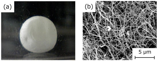 The HSBC gel encapsulating the glass beads was cleaned with phosphate-buffered saline (PBS) immediately after culturing. After removing the silicone oil using ethanol, the HSBC gel encapsulating the glass beads was dried using the supercritical drying method. Observation of the external appearance of this HSBC gel revealed that the BC gelatinous membrane was formed on the entire surface of the sphere (Figure 5a). Scanning electron microscopy (SEM) observation of the HSBC aerogel indicated a network structure of cellulose nanofibers with a diameter of about 30 nm (Figure 5b). These results mean that the BC gel film was produced at the interface between the cell suspension attached onto the Ca-Alg gel and the silicone oil or the 96-well plate.