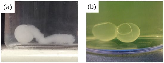 In contrast, when the obtained gel was immediately immersed in PBS, the PBS gradually passed through the BC gelatinous membrane and dissolved the Ca-Alg gel without rapid swelling, and no holes formed during the dissolving process (Figure 5a). The formation of a spherical-shaped BC gelatinous membrane on the entire surface was observed, and the BC gelatinous membrane was not perforated due to the swelling of Ca-Alg gel during the dissolving process. Also, the silicone oil adhered onto the surface of the obtained gels did not dissolve in PBS but floated out to the PBS. Therefore, the silicone oil could be separated from the gels.