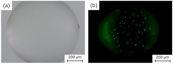 We prepared 2 mL of 0.5 wt% Na-Alg aq with 200 µL of 0.1% (w/v) fluorescent particles. Figure 8 depicts the Ca-Alg gel encapsulating the fluorescent particles with a diameter of 1.0 mm that were prepared by dropping 1.50 µL of this aqueous solution on 10 wt% CaCl2 aq. Fluorescent particles were present inside the Ca-Alg gel and they did not leak out, as shown in Figure 8. In method B, the cell suspensions containing the small Ca-Alg gel were cultured in silicone oil. The size of the HSBC gel produced with this method was almost the same as the cell suspension droplet. The size of the HSBC gel was not affected even if the Ca-Alg gel swelled. To prepare the small-sized Ca-Alg gel, minute amounts of Na-Alg aq must be accurately suctioned using a micropipette. The low concentration and low viscosity Na-Alg aq was suitable for this purpose. However, when the amount of suspended substances in Na-Alg aq increased, no spherical Ca-Alg gel was obtained at low Na-Alg concentrations. Na-Alg aq droplets did not undergo gelation because the amount of Na-Alg was too low. Thus, 0.5 wt% Na-Alg aq was found to be appropriate.