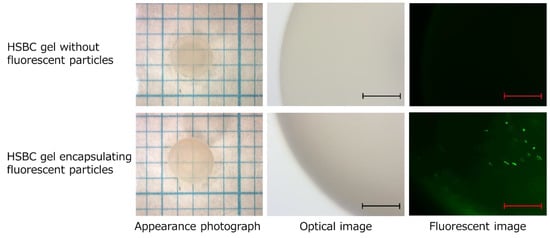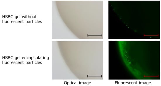 Photographs of HSBC gel without fluorescent particles and HSBC gel encapsulating fluorescent particles. Scale bar: 300 µm.