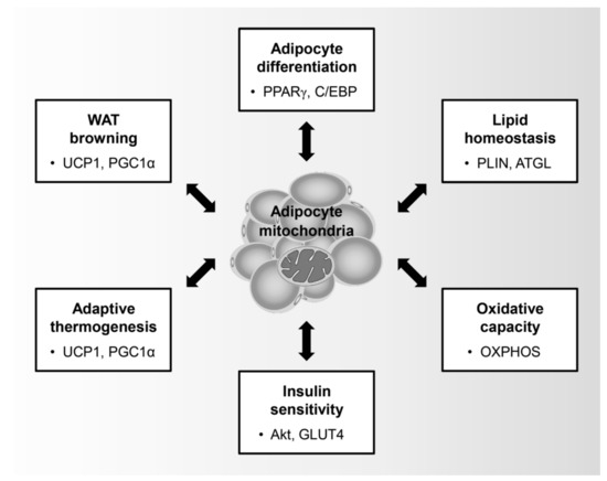 Mitochondria are key organelles that control the physiological role of adipocytes such as adipocyte differentiation, lipid homeostasis, insulin sensitivity, oxidative capacity, adaptive thermogenesis, and browning of WATs (Figure 1). In particular, adipocyte differentiation is characterized by an induction in mitochondrial metabolism. During adipogenesis, preadipocytes undergo sequential transcriptional regulation by adipogenic regulators such as peroxisome proliferator-activated receptor-γ (PPARγ), CCAAT-enhancer-binding proteins (C/EBPs), and PPARγ coactivator 1-α (PGC1α), thereby leading to the promotion of mitochondrial biogenesis [35]. In addition, mitochondrial remodeling is involved in the quantitative and qualitative changes of the mitochondria during adipocyte differentiation [36]. Within 4 days of adipogenic induction of 3T3-L1, which are immortalized white preadipocytes, the expression of mitochondrial proteins and the number of mitochondria increases dramatically and is accompanied by qualitative changes in the mitochondrial composition, including pyruvate carboxylase and aconitase, which are involved in fatty acid metabolism [37]. Moreover, the increased oxygen consumption rate of the differentiated adipocytes compared to that of the preadipocytes is clear evidence that mitochondria are activated during adipocyte differentiation [38].